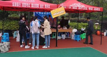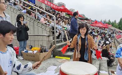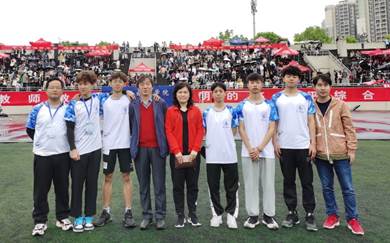 学院领导与学生一起为运动员击鼓加油 学院领导与学生志愿者在一起