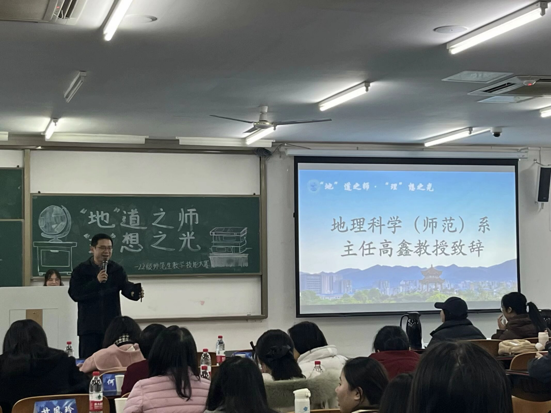 副院长张云耀教授与地理科学系主任高鑫教授为本次大会致辞,张云耀教授肯定了本次大赛的意义并期待同学们的精彩表现,高鑫教授表示本次师范生大赛对提升同学们的师范生技能具有重要意义并为同学们加油助威。