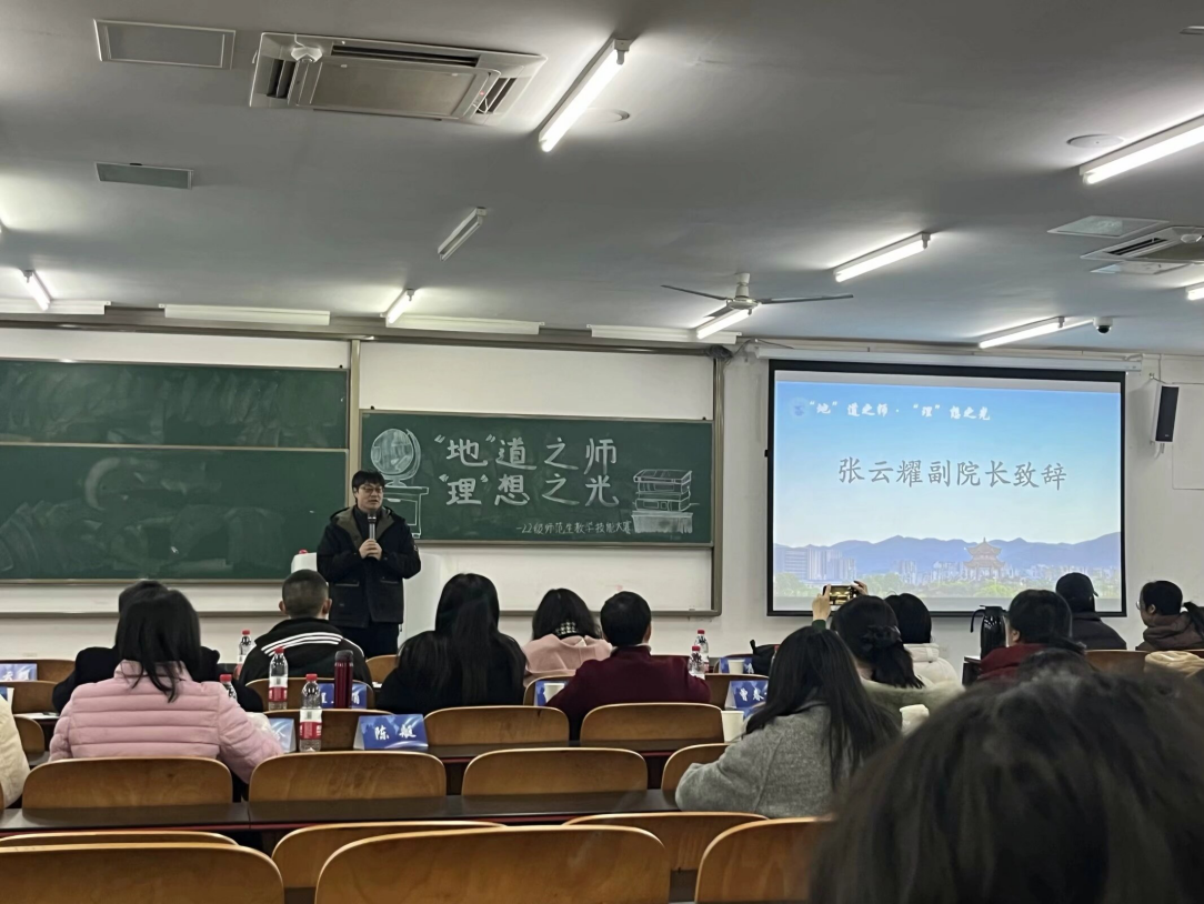 2024年12月12日下午14:00,以“‘地’道之师,‘理’想之光”为主题的2022级师范生技能展示大赛决赛在特教楼T2213举行,本次大赛由地理协会承办。副院长张云耀教授与地理科学系主任高鑫教授参加了开幕式,大赛活动邀请到了科学城巴蜀中学校财务人事处副主任钟正付老师,育才中学校甘露老师担任校外专家评委,与校内专家一起担当本次大赛评委。