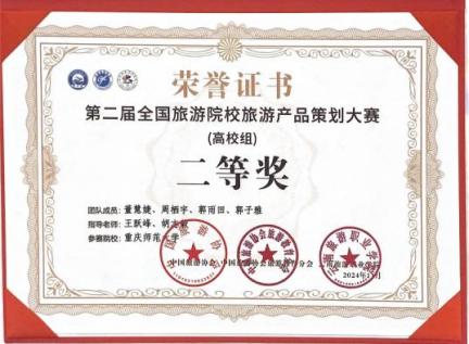2024年11月16日,由中国旅游协会旅游教育分会主办的第二届全国旅游院校旅游产品策划大赛决赛圆满结束,做爱影片 2023级职业技术教育(旅游服务)专业研究生李鑫雷、李歆如、谭瑶瑶和李炆组成的队伍获一等奖(指导老师胡传东教授、张云耀教授),由2023级学科教学(地理)专业研究生董慧婕、职业技术教育(旅游服务)研究生周栖宇、2024级学科教学(地理)专业研究生郭雨田和郭子雅组成的队伍获二等奖(指导老师王跃峰教授、胡志毅教授)。做爱影片 获得优秀组织奖。