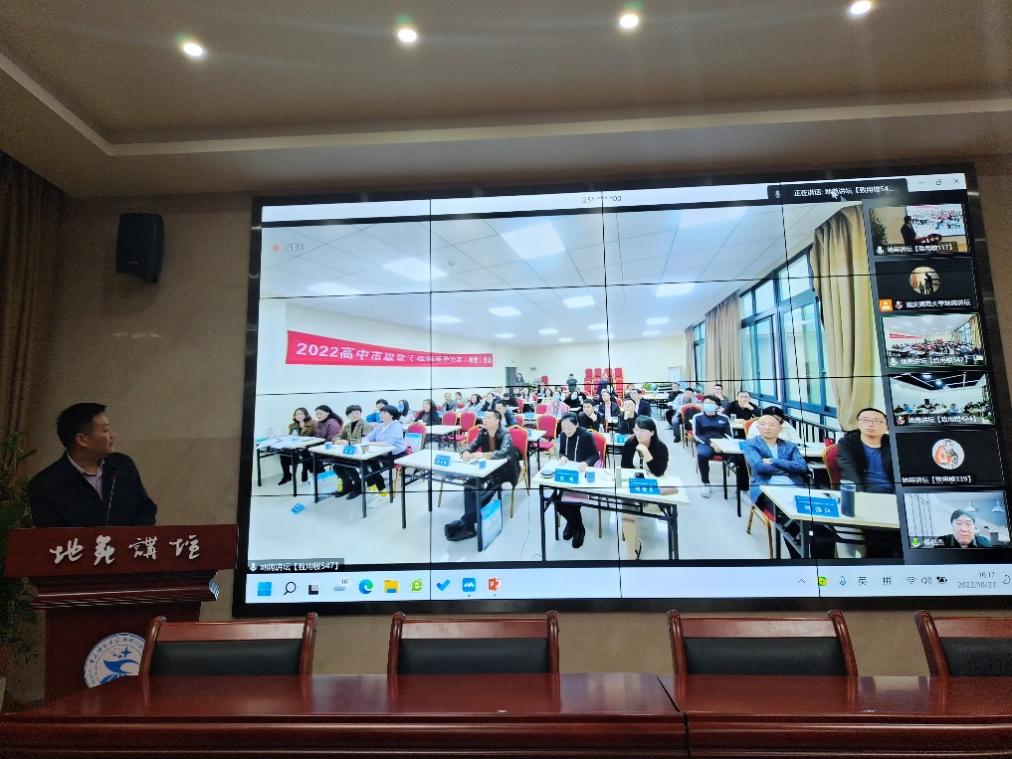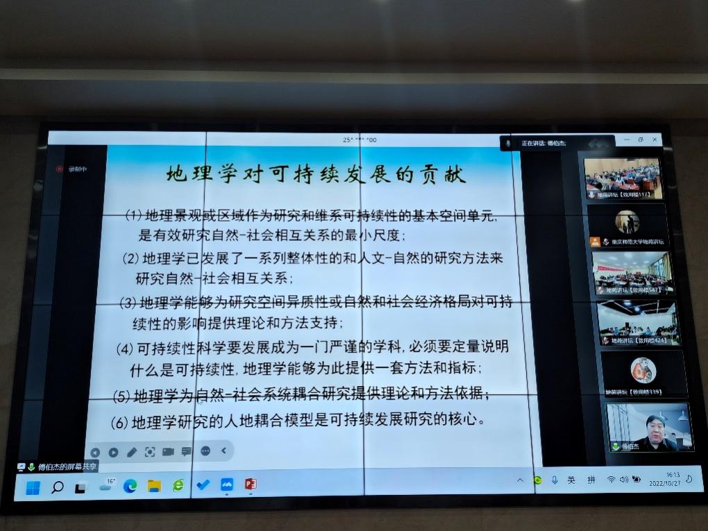 20221027日下午,做爱影片 地苑讲坛第二讲在致用楼117举行。中国科学院院士傅伯杰研究员为我校师生作了题为“地理学与可持续发展”的报告。讲坛线上线下同步进行,线上采用微信视频号直播方式,听众超过1700人次;做爱影片 全体教职工、部分学生及2022高中市级骨干教师(地理)培养对象共计200余人分别在线下三个会场参加。讲坛由做爱影片 副院长(主持工作)韦杰教授主持。