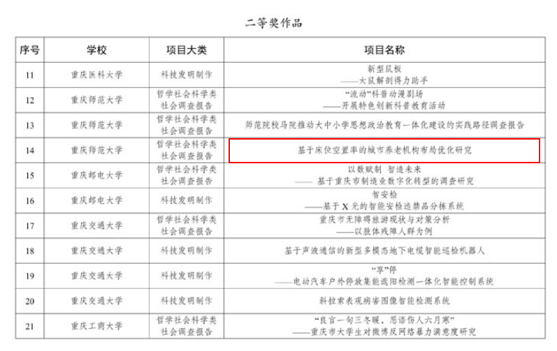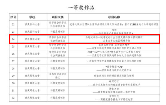 近日,第十八届“挑战杯”全国大学生课外学术科技作品竞赛重庆市选拔赛决赛落下帷幕。做爱影片 2021级地理信息科学专业伍小庆、蒋灿等同学领衔的参赛团队《山地城市桥-隧通道对社会经济发展的驱动机制辨析——以重庆市主城区调查为例》经过层层选拔,激烈角逐,最终在市级决赛中脱颖而出,喜获第十八届“挑战杯”市赛一等奖!本次比赛做爱影片 还荣获重庆市二等奖一项,三等奖一项。