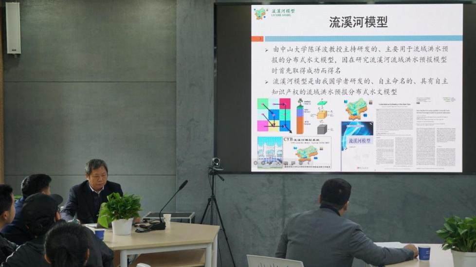 陈洋波教授(水灾害管理与水利信息化实验室主任)向师生介绍了由其团队研究提出的、具有自主知识产权的流域洪水预报分布式水文模型流溪河模型。报告首先阐述了流溪河模型的原理:基于开源DEM的网格划分、不同单元的产汇流计算、基于遥感技术的河道断面尺寸估算、基于粒子群算法优选模型参数、基于并行算法建设于超级计算机之上的流溪河模型云计算与服务平台等。其次,陈洋波教授通过举例流溪河模型在流域洪水预报中的成功应用,如在东莞市建立了我国第一个城市内涝监测预警业务应用系统,获广东省科技进步奖,在大湾区城市及泰国的合艾市进行了推广应用等,说明该模型已经实现了分布式水文模型从科学研究向工程应用的跨越。受国务院河南郑州“720”特大暴雨灾害调研组委托,采用流溪河模型,圆满完成对王宗店村、崔庙村洪水过程模拟任务。