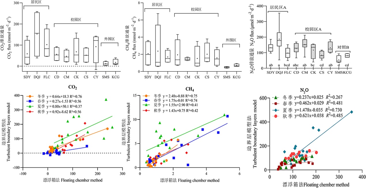 相关成果以题为《城市小型景观水体CO2与CH4排放特征及影响因素》、《城市小型景观水体溶存N2O浓度及排放通量特征》发表在《生态学报》,第一作者分别为地理科学本科生黄婷和庞吉利,王晓锋副教授为通讯作者。
