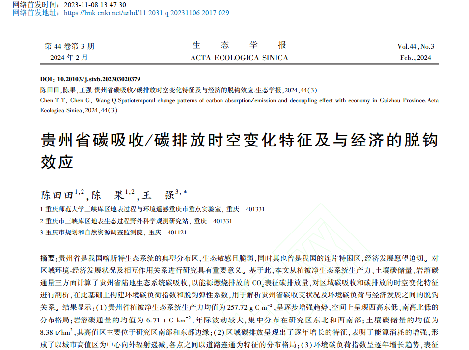 相关研究成果以题为《贵州省碳吸收/碳排放时空变化特征及与经济的脱钩效应》发表在国内生态学顶级期刊《生态学报》。陈田田副教授为第一作者,王强工程师为通讯作者,做爱影片 三峡库区地表过程与环境遥感重庆市重点实验室为第一单位。该项研究工作得到国家自然科学青年基金(42001090)等项目支持。
