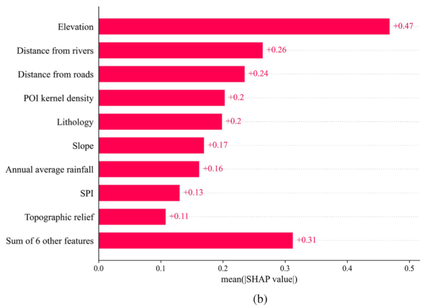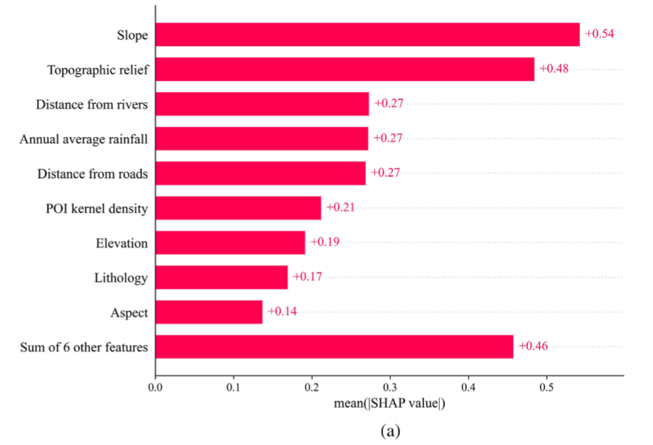 利用两种算法构建了两地的滑坡易发性区划模型,结果表明RF模型有着较高的精度。接着采用RF-SHAP进行可解释研究。基于SHAP模型构建了两地的滑坡因子重要性排序图。