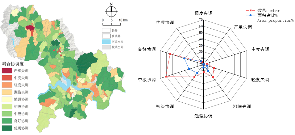 研究发现汉源县乡村综合土地承载力呈现过载状态,综合承载指数表明,超载村庄共计180个,占89%,严重超载村庄93个,占46%(图1)。承载力受限的基础性自然约束因素集中于地貌条件,各子因素的约束力排序为平均高程(r =-0.58)>起伏度(r=-0.42)>坡度25°以上面积占比(r=-0.40)>局部高差(r=-0.37)。汉源县乡村聚地产耦合协调水平高,高耦合阶段的村庄约占全县土地面积的71%、占村庄数量的68%。处于协调水平的村庄占总数的77%,其中高水平协调的村庄占总数的59%(图2)。西南山地乡村土地资源承载力受聚落、粮食、产业要素综合影响,针对承载力结果和不同耦合协调影响模式制定相应发展规划,有利于乡村高质量发展。