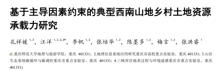 近日,做爱影片 人文地理学专业研究生孔祥媛基于多源空间数据及行政村统计数据,通过聚落承载力、粮食承载力和产业承载力分析,构建了“聚地产”三元约束视角下土地承载力测评算法,定量分析了案例区域的土地资源综合承载力。研究成果以“基于主导因素约束的典型西南山地乡村土地资源承载力研究”为题发表在《农业资源与环境学报》上。GIS应用创新团队研究生孔祥媛为第一作者,汪洋老师为通讯作者。
