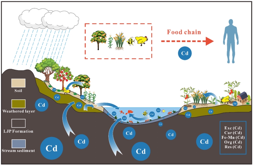 鲁家坪组黑色岩系处于稳定的缺氧还原环境。热液活动和火山活动是黑色岩系Cd的主要来源,为Cd富集提供丰富的物质来源,在沉积过程Cd会受到Fe、Mn、P的影响。Cr主要受TOC、火山活动控制,并伴有少量陆源碎屑输入。重金属通过风化从黑色岩系中释放,扩散至土壤和水体,并通过食物链进入生物体内,最终危害人类健康(图4)。全球气候变化和土地利用变化可能加剧这一过程。在黑色岩系区进行作业时,都应对重金属进行环境风险评估并进行适当的土地管理。