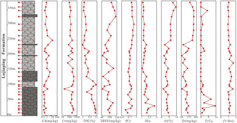 自然地理专业研究生肖慧娴以位于大巴山逆冲带的城口县北部下寒武统鲁家坪组(LJP)剖面出露黑色岩系为研究对象,采集30件岩石样品,硅质板岩(SS)、碳质板岩(CS)各15件,室内分析其常量和微量元素含量,逐级提取岩石Cd、Cr赋存形态,通过风险评估指数法(RAC)、次生相原生相比值法(RSP)对Cd、Cr进行生态风险评价,以揭示黑色岩系镉(Cd)、铬(Cr)的富集机制、赋存形态及其生态环境效应。研究成果以“Ecological Risk of Cd and Cr in the Black Rock Series should be noticed: Based on the study of Enrichment Mechanism, Occurrence Form in the Lower Cambrian Lujiaping Formation”为题发表在《Journal of Hazardous Materials》(中科院一区top,IF=12.2)上。GIS应用研究创新团队研究生肖慧娴为第一作者,刘永林老师为通讯作者。