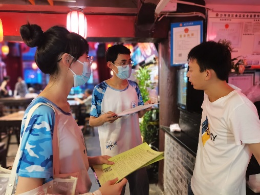 接着,社会实践服务队来到磁器口古镇街头,热情地向游客发放文明旅游宣传页。由于暑期来临,磁器口古镇也将迎来游客高峰期,为保证景区旅游安全有序,每到一家店铺,实践队员都耐心地提醒商铺人员落实好疫情防控相关措施,叮嘱备好消毒用品,做好消杀,仔细查看两码,发现异常情况要及时上报,广泛普及疫情防控知识。同时积极地向游客宣传文明旅游、疫情防控、遵守公共秩序、保护生态环境等内容,营造文明和谐、安全有序的旅游环境。