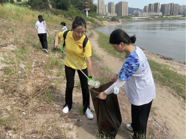 在嘉陵江畔,实践团成员左手垃圾袋,右手夹钳,顶着烈日清理河道周围以及马路边的塑料瓶、烟头、零食口袋等垃圾,不怕苦也不怕累,为维护古镇美好容貌助力。成员们用实际行动倡导文明行为,响应了习近平总书记所说“绿水青山才是金山银山”的伟大理念。