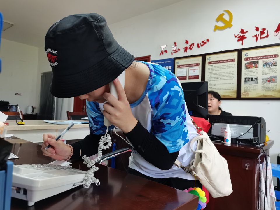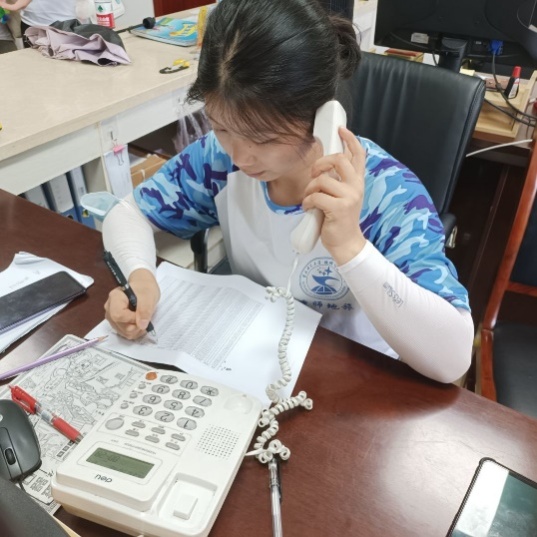 实践队员通过社区办公室电话联系居民统计疫苗接种情况  (周秋云 摄)