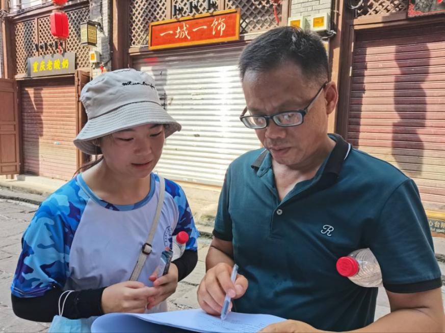 发动磁器口游客填写关于垃圾分类的调查问卷  舒影欣摄