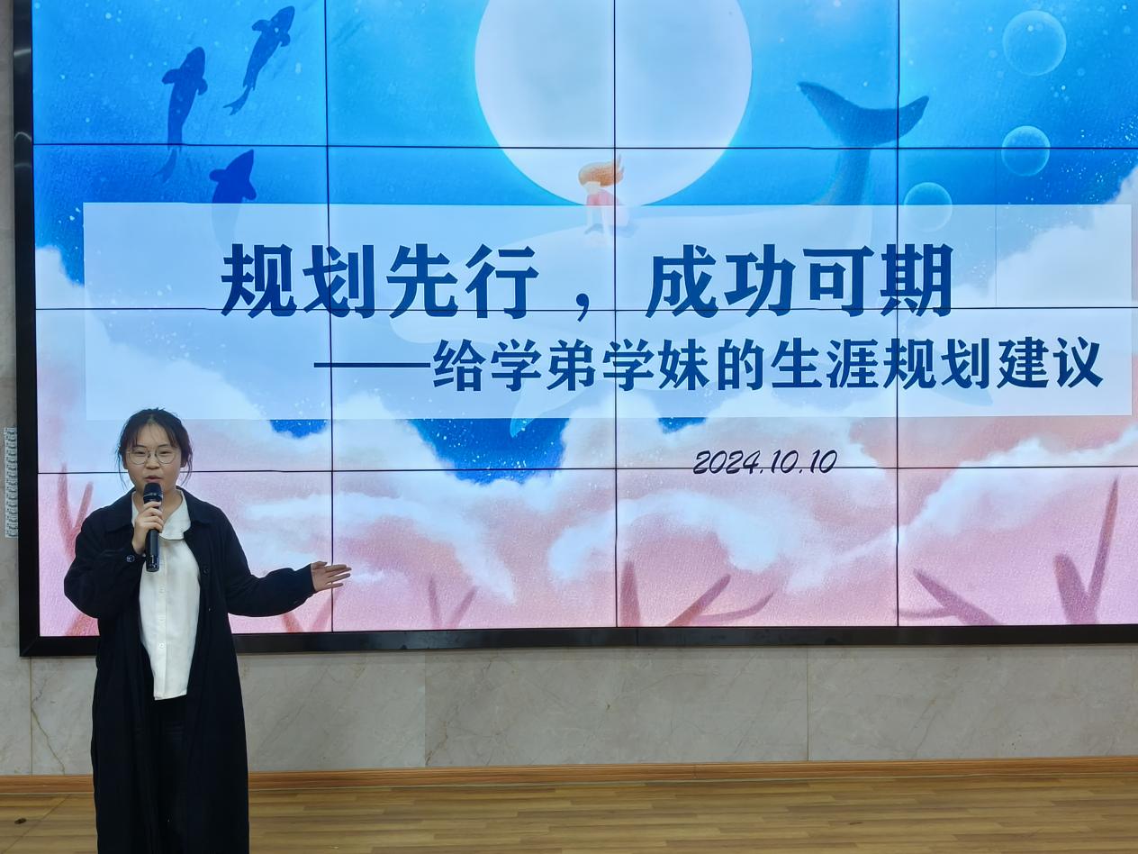 接着,高年级生涯规划委员代表 23级地理信息科学专业谭菀檠学姐结合视频内容进行了经验分享。她以自身的成长经历为例,讲述了她在大学期间如何逐步明确自己的职业目标,并为之努力奋斗。谭菀檠学姐还强调了在大学中积极参加实践活动、拓展人际关系、提升专业技能的重要性。同时,委员们还鼓励新生们要敢于尝试不同的领域,不断探索自己的兴趣和潜力。