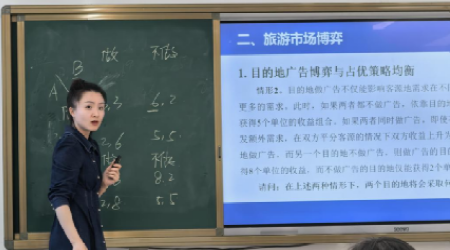 张晨老师在《旅游市场博弈论》课程中,以课堂活动为载体,让学生通过“旅游企业竞争模拟”亲身体验博弈策略。她结合旅游广告市场真实案例,引导学生构建博弈逻辑体系,实现“学用结合”。