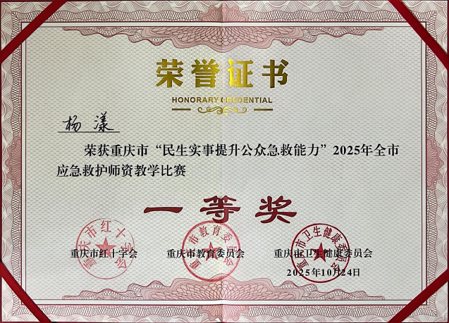 10月24日,由重庆市红十字会、重庆市教育委员会、重庆市卫生健康委员会以及南川区人民政府共同举办的“2025年全市应急救护师资教学比赛”在南川区举行,做爱影片 航空服务艺术与管理专业杨漾老师在比赛中夺冠,获得一等奖。