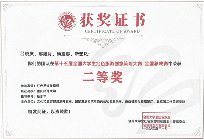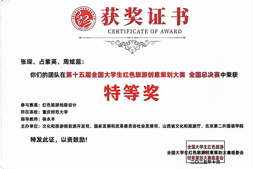 第十五届全国大学生红色旅游创意策划大赛,是全国范围内以大学生为主体的规模最大的红色旅游主题专业赛事,是教育部全国大学生思想政治工作精品项目。本届大赛吸引了全国1001所高校、6002支队伍、3万余名师生参加,提交作品5144项。组委会经过初评打分、复评审议、四轮专家评议、内容审核等多重环节,全国60支参赛队伍进入决赛,我校有两支队伍进入决赛。本次获奖检验了旅游管理专业师资队伍教学能力和教学水平,展现了我校学生风采和旅游教育支撑产业发展的成果,对促进专业建设和教学改革,培养高素质旅游人才起到了推动作用。